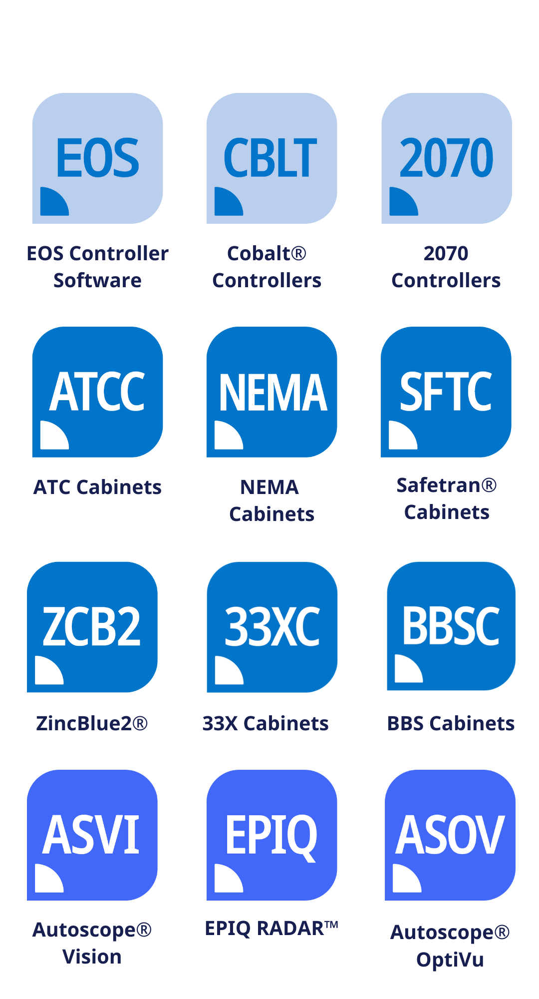 Cabinets: Advanced traffic control cabinets from Econolite’s ATCC, NEMA, Safetran®, and 33X product lines, as well as through the Blue Series, offering the most advanced diagnostics, monitoring, and safety features with the best lead times in the industry. Also offering the Best-in-Class Battery Back-up Systems (BBS), such as ZincBlue2®.